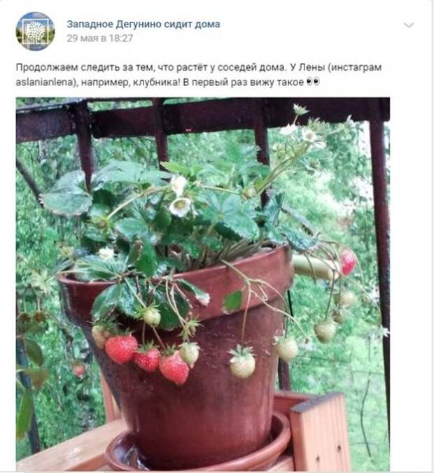 «Продолжаем следить за тем, что растёт у соседей дома. У Елены, например, клубника! В первый раз вижу такое», — такая подпись появилась под фотографией горшка с клубникой.